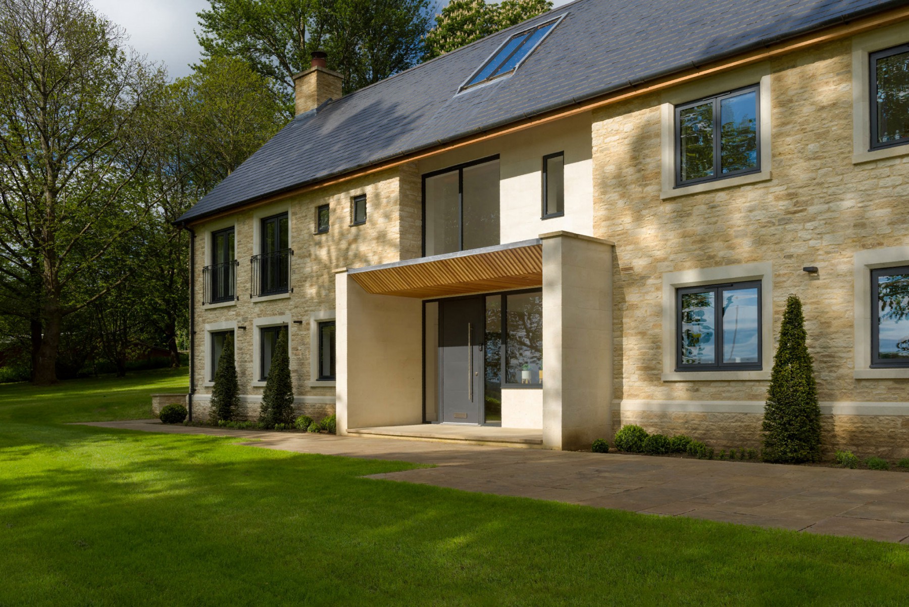 The property is a house of two sides. The public, street-facing elevation is the grander of the two. Window reveals are in bespoke dressed stone. A continuous stone corbel surrounds the base of the property, stamping the property onto its site. A cut stone modern porch draws the eye and clearly identifies the main entrance. The design of the back of the house is simpler, with large expanses of glass opening the home up to a series of terraces.